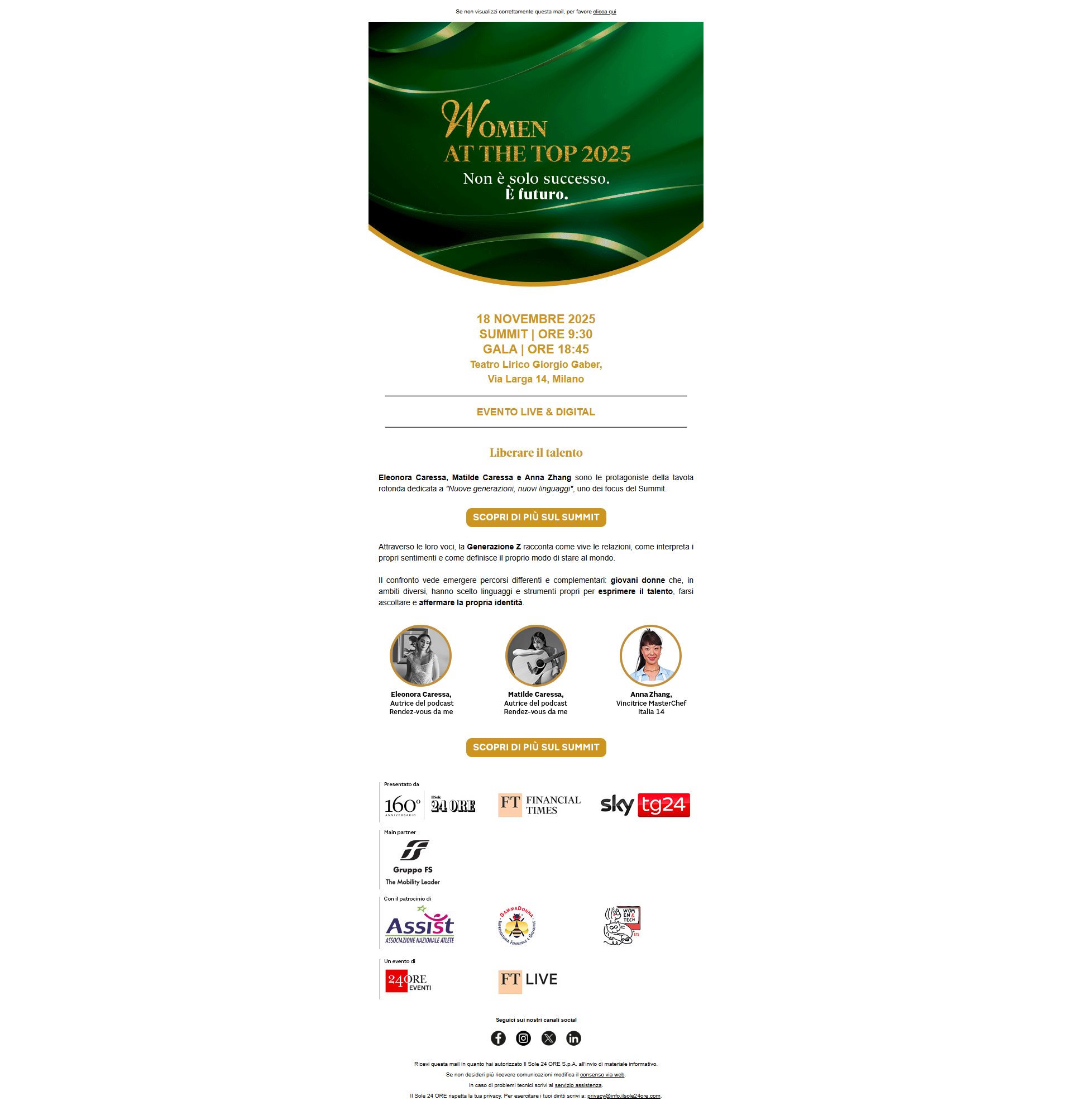 Torna per la sua terza edizioneWomen at the Top al Teatro Lirico Giorgio Gaber in Milano.Il Sole 24 Ore, in collaborazione con il Financial Times e la media partnership di Sky TG24, ripropone il grande progetto dedicato all’empowerment femminile composto da un doppio appuntamento: Summit e Gala. Storie di donne di successo attive nel mondo delleistituzioni pubbliche e private, delle imprese, della ricerca, della cultura, dello spettacolo e dello sport: capaci di ispirare le future generazioni contribuendo a un cambiamento in grado di abbattere stereotipi. La giornata culminerà con il premio We Award – Women Excellence 2025, che punta a scoprire talenti emergenti e a celebrare donne dalla carriera eccezionale.